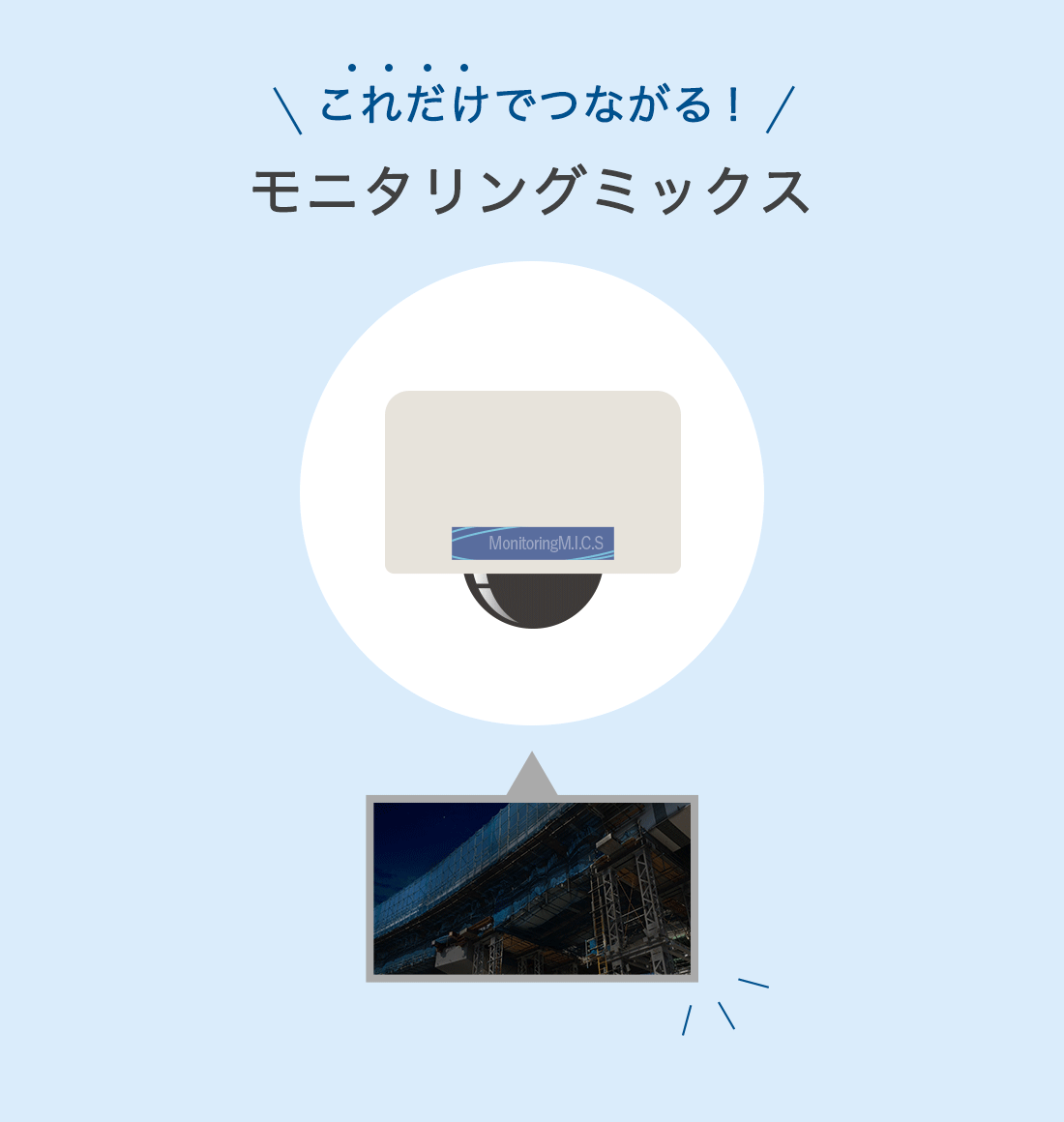 電源を入れて3分以内に全世界でモニタリング可能。見たい場所へ簡単設置、PTZカメラでパーン360度、チルト128度、42倍ズーム機能で設置場所の影響をうけません。M.I.C.S本体と電源があればどこでも設置OK! 面倒な設定や準備は一切かかりません!