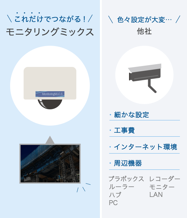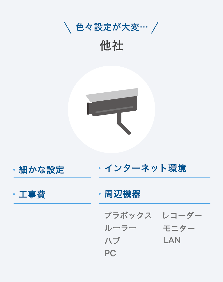 約2時間×数回 作業人数が2~3人必要 機材・工事、設定・人件、交通費がコストとしてかかります。そしてカメラの工事が終わっった後、事務所内の作業に入り設置・設定を終えてから見れるので、時間がかってしまう |