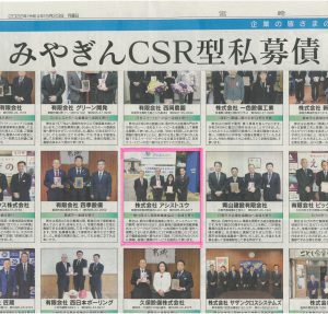 みやぎんCSR型私募債について、宮崎日日新聞に掲載されました。 弊社からは、一般社団法人宮崎県電業協会へ金銭を寄付いたしました。 この度 これまで28年間お世話になった 宮崎電業協会様、会員の皆様方に少しでも感謝の気持ちをお届けできて大変うれしく思っています。 これからも喜ばれる業務システムの提供をして参りますので、引き続きよろしくお願い申し上げます。